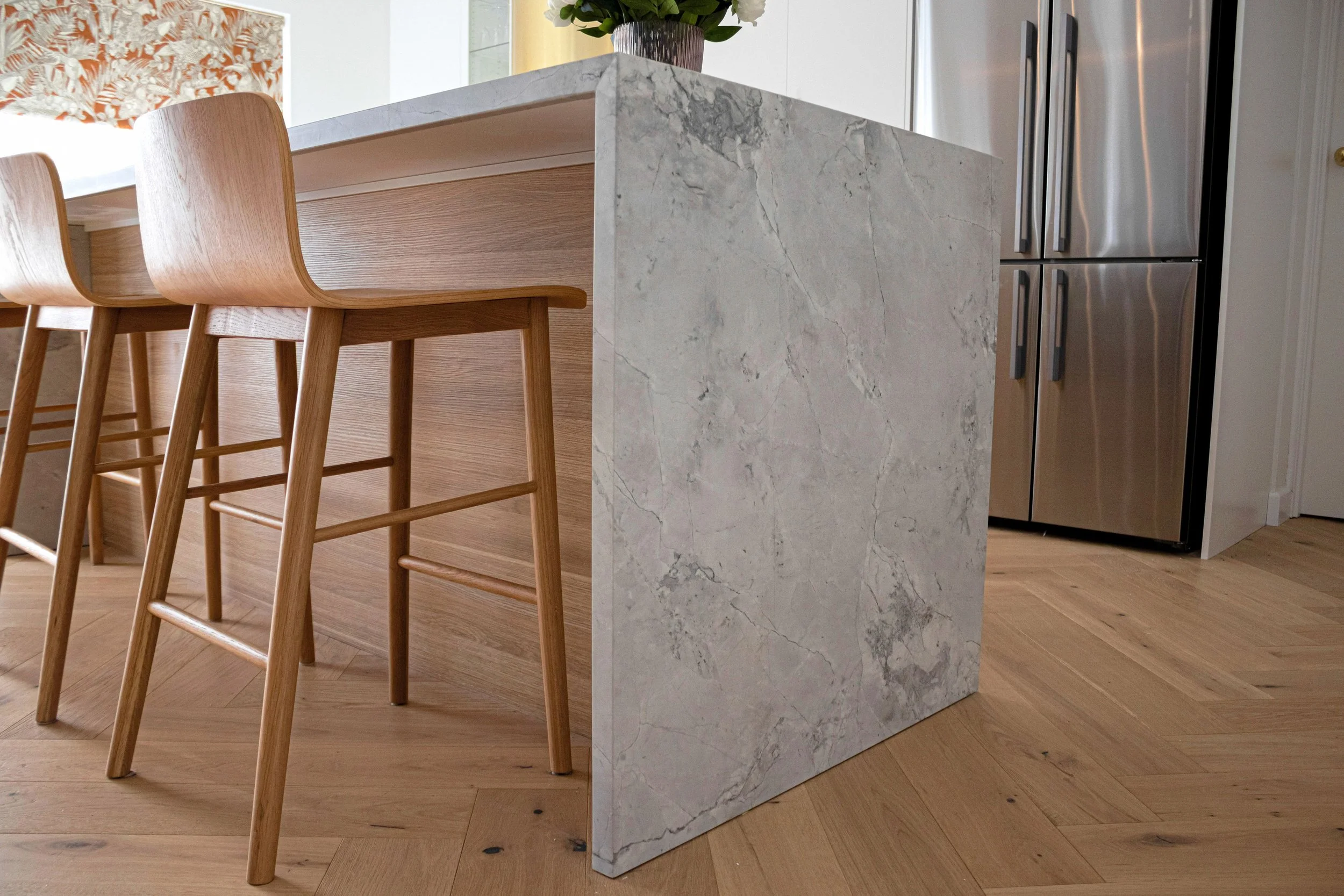 Wrap the island: Stone the benchtop, waterfall ends, and continue down to a plinth so the island reads as a sculptural block, not an afterthought.